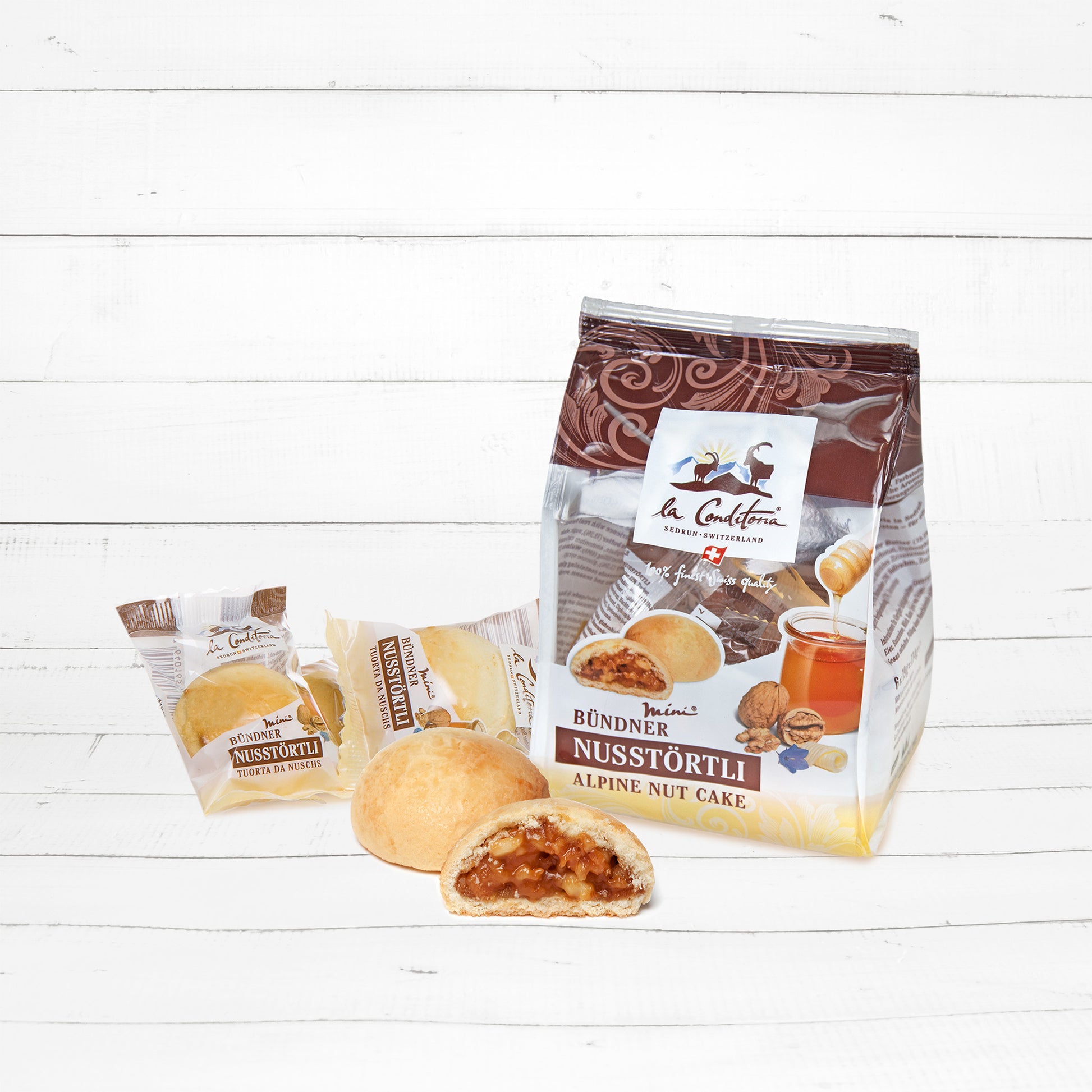Die Törtli sind einzeln verpackt, sodass sie nach dem Öffnen des Beutels länger frisch bleiben. Das Mini Bündner Nusstörtli ist ideal als süsse Kleinigkeit zwischendurch oder zum Kaffee.