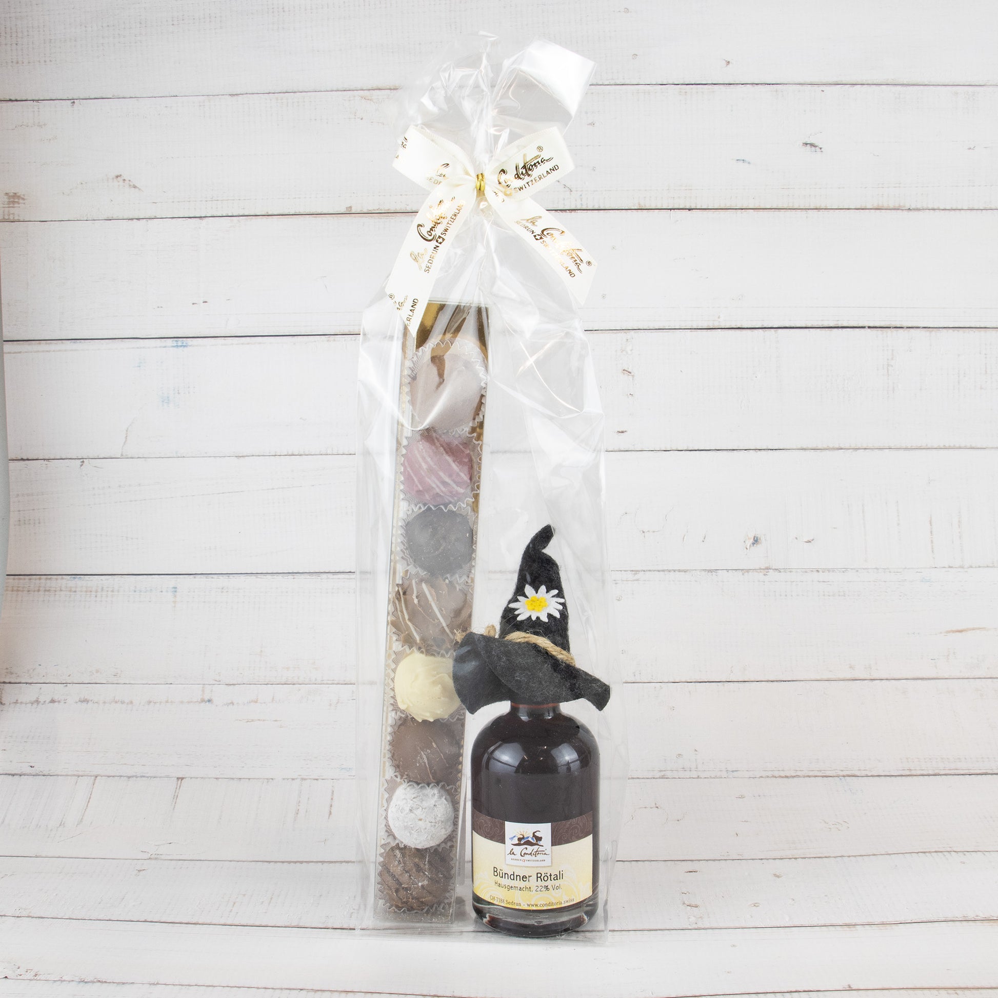 Verwöhne dich oder deine Liebsten mit unserem exklusiven Geschenkset, das die Tradition und den Geschmack der Schweizer Alpen vereint. Enthalten sind der edle Bündner Rötali, ein fein gewürzter Kirschlikör aus Graubünden, und die handgefertigten Alpentruffes, edle Truffes in verschiedenen köstlichen Varianten, die mit feinster Schweizer Schokolade zubereitet werden.