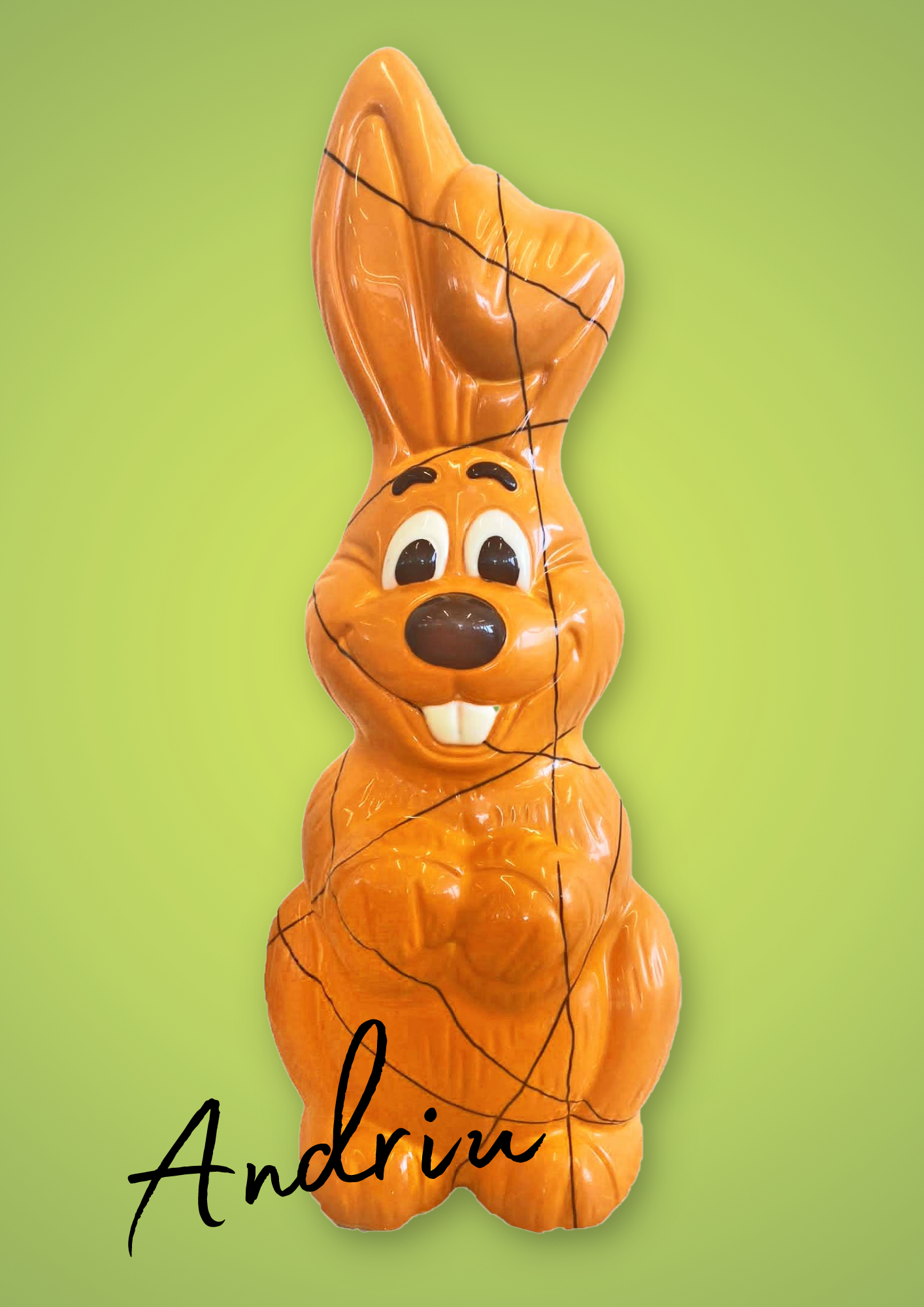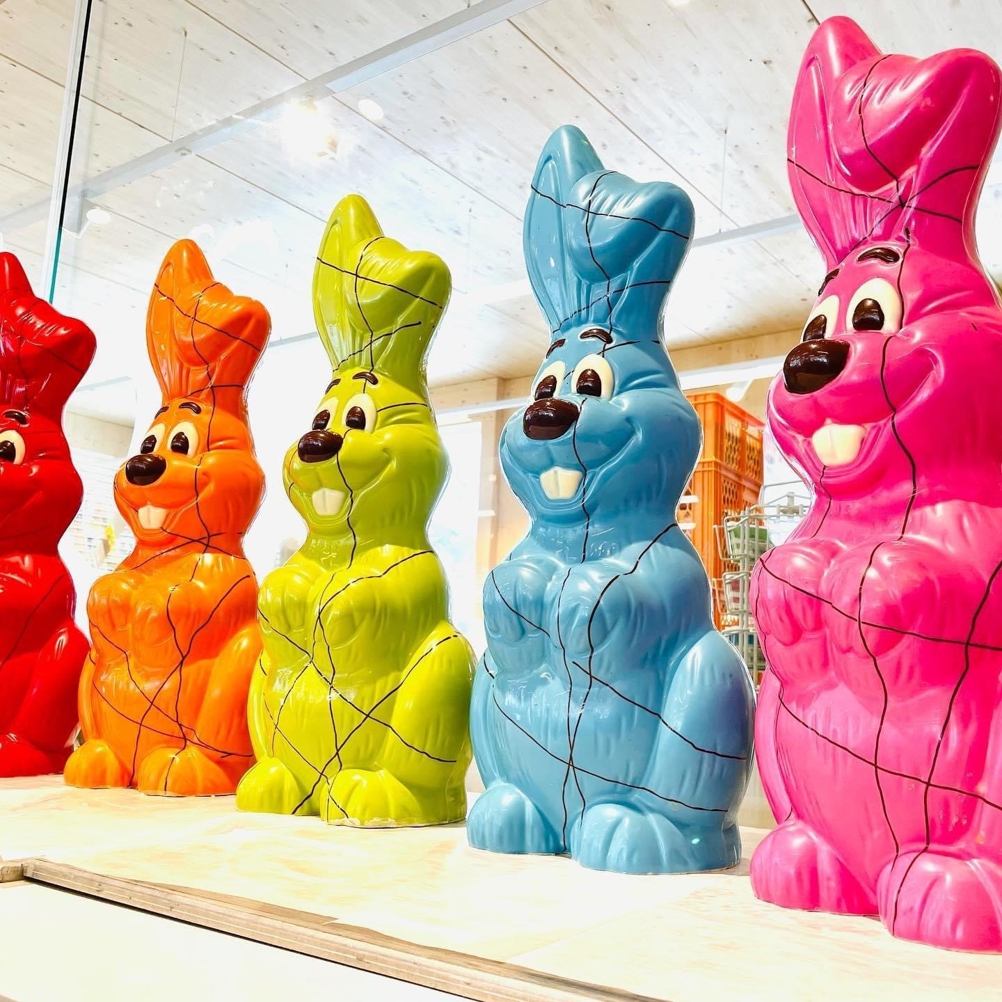 Riesenosterhase aus Schweizer Schokolade. Verschiedene Farben möglich. Grün, Orange, Schneeweiss, blau, rot, gelb, violett
